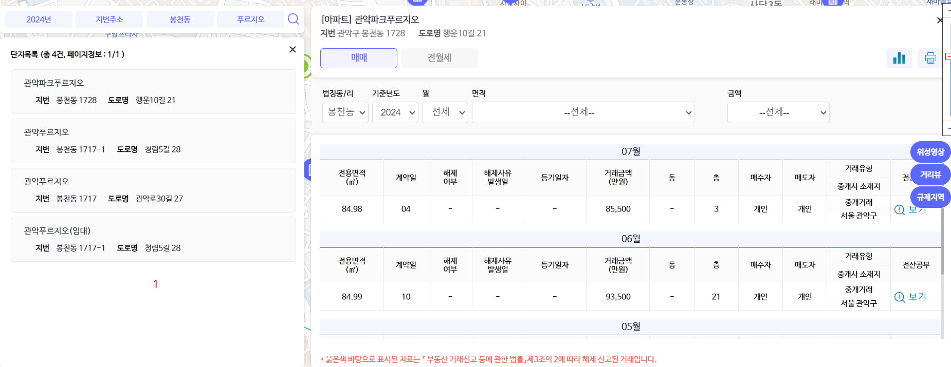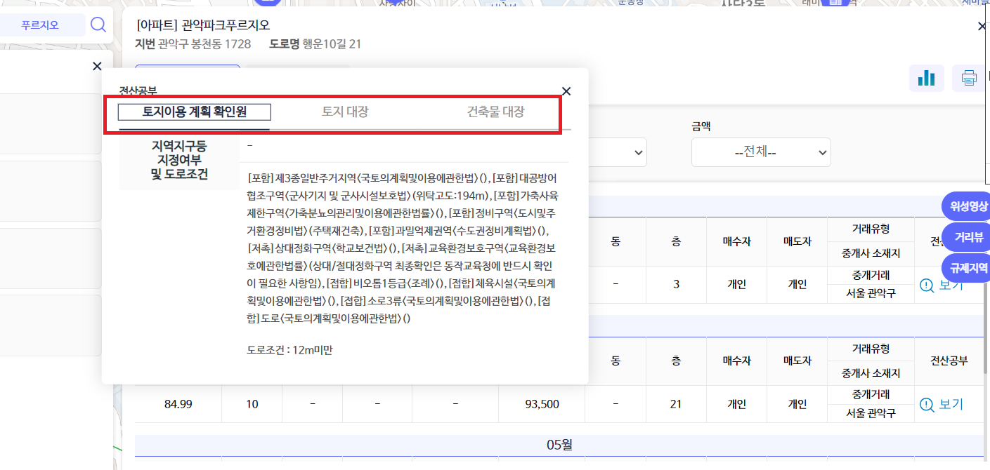 그리고 위의 이미지처럼 오른편에 위성영상, 거리뷰, 규제지역 등의 정보도 제공하고 있으니 클릭하셔서 살펴보시는 것도 추천합니다.